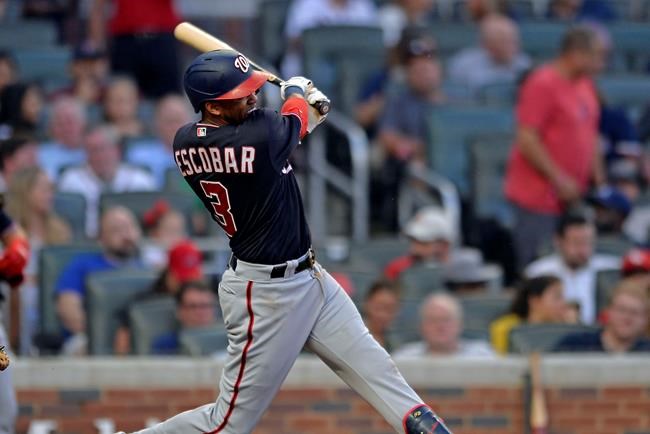 Washington Nationals' Alcides Escobar bats in the fourth inning of a baseball game against the Atlanta Braves, Saturday, Aug. 7, 2021, in Atlanta. (AP Photo/Edward Pio Roda)