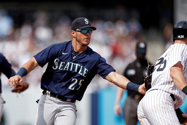 Seattle Mariners shortstop Dylan Moore (25) tags out New York Yankees' DJ LeMahieu during the sixth inning of a baseball game on Saturday, Aug. 7, 2021, in New York. (AP Photo/Adam Hunger)