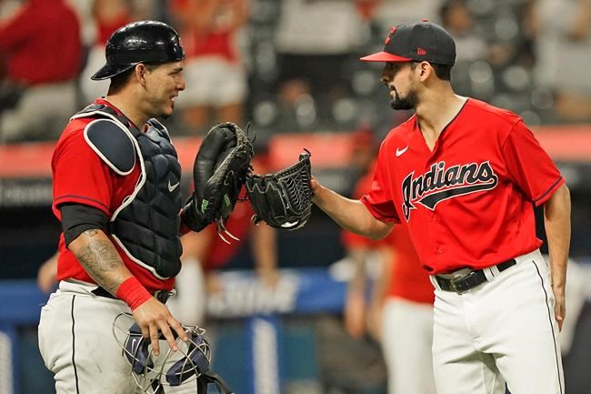 Cleveland Indians relief pitcher Nick Sandlin, right, is congratulated by catcher Wilson Ramos after they defeated the Cincinnati Reds in of a baseball game, Monday, Aug. 9, 2021, in Cleveland. (AP Photo/Tony Dejak)