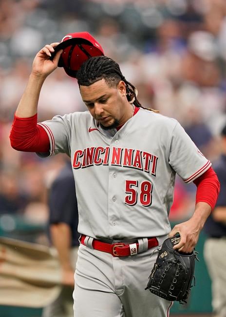 Cincinnati Reds starting pitcher Luis Castillo walks to the dugout in the fourth inning of a baseball game against the Cleveland Indians, Monday, Aug. 9, 2021, in Cleveland. (AP Photo/Tony Dejak)