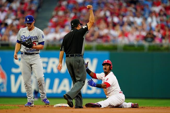 Nola fanned Trea Turner to start the game, then Max Muncy and Will Smith. He relied on his breaking stuff and struck out the side again in the third for seven strikeouts — all swinging — over the first three innings.