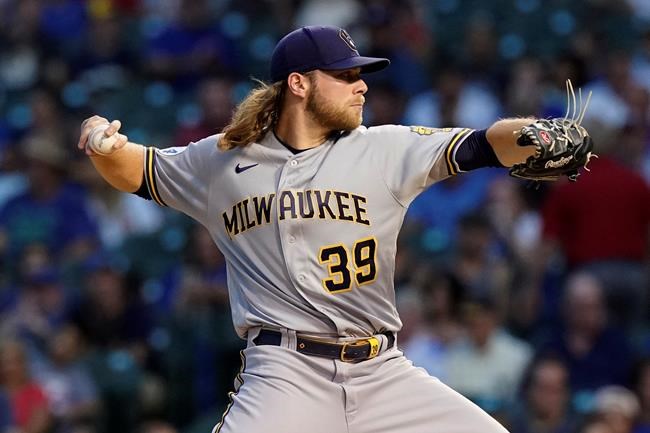 Milwaukee Brewers starting pitcher Corbin Burnes throws to a Chicago Cubs batter during the first inning of a baseball game in Chicago, Wednesday, Aug. 11, 2021. (AP Photo/Nam Y. Huh)