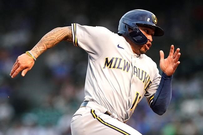 Milwaukee Brewers' Kolten Wong heads home to score on a Christian Yelich single during the first inning of the team's baseball game against the Chicago Cubs in Chicago, Wednesday, Aug. 11, 2021. (AP Photo/Nam Y. Huh)