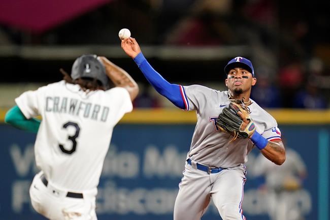 Texas Rangers second baseman Andy Ibanez, right, throws to first base after forcing out Seattle Mariners' J.P. Crawford (3) at second base during the fifth inning of a baseball game Tuesday, Aug. 10, 2021, in Seattle. Mitch Haniger was out at first on the double play. (AP Photo/Elaine Thompson)