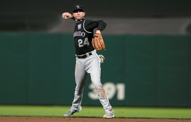 Rockies: SS Trevor Story pinch hit in the ninth but was out of the lineup a day after being hit by a pitch in the forearm in the fourth before exiting the game. “He’s going to be fine,” manager Bud Black said. … Brendan Rodgers played in place of Story at shortstop after missing the previous four games with a bruised right from being hit by a pitch Saturday. Rodgers singled in the first to extend his hitting streak to 15 games.