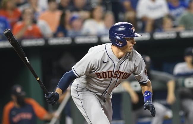 Houston Astros' Jason Castro hits a two-run single to give them the lead over the Kansas City Royals during the seventh inning of a baseball game Wednesday, Aug. 18, 2021, in Kansas City, Mo. (AP Photo/Reed Hoffmann)