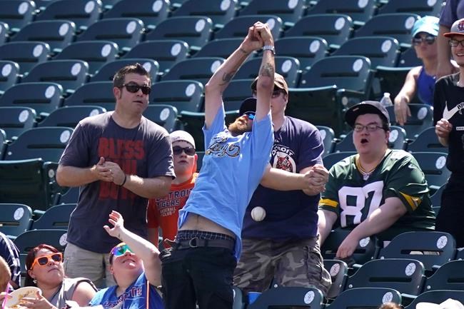 A baseball fan is unable to catch the solo home run hit by Toronto Blue Jays' Bo Bichette during the first inning of a baseball game against the Detroit Tigers, Sunday, Aug. 29, 2021, in Detroit. (AP Photo/Carlos Osorio)
