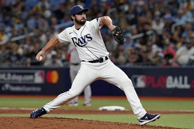 Tampa Bay Rays relief pitcher J.P. Feyereisen throws to a Boston Red Sox batter during the eighth inning of Game 1 of a baseball American League Division Series, Thursday, Oct. 7, 2021, in St. Petersburg, Fla. (AP Photo/Steve Helber)
