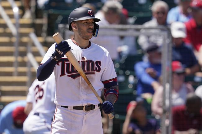 Minnesota Twins shortstop Carlos Correa prepares to bat in the fourth inning during a spring training baseball game against the Boston Red Sox at Hammond Stadium Sunday, March 27, 2022, in Fort Myers, Fla. (AP Photo/Steve Helber)