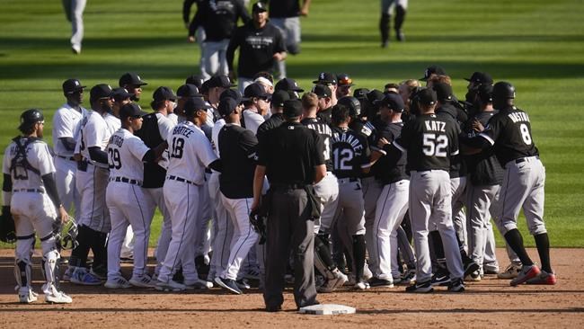 Dugouts cleared after Chicago slugger José Abreu and Tigers shortstop Niko Goodrum exchanged words when Abreu was tagged out attempting to steal second. The dustup occurred after Abreu was hit by a pitch for the 21st time this season.