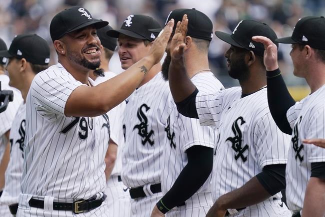 Chicago White Sox's Jose Abreu, left, greets teammates as he runs on the field during an opening day baseball game against the Seattle Mariners in Chicago, Tuesday, April 12, 2022. (AP Photo/Nam Y. Huh)
