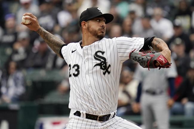 Chicago White Sox starting pitcher Vince Velasquez throws against he Seattle Mariners during the first inning of an opening day baseball game in Chicago, Tuesday, April 12, 2022. (AP Photo/Nam Y. Huh)