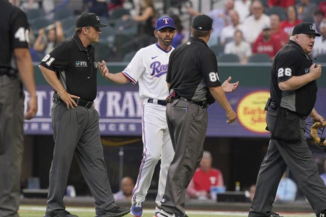 Texas Rangers manager Chris Woodward, center left, questions a call as the umpire crew walks off the field, ending the tenth inning of a baseball game against the Colorado Rockies in Arlington, Texas, Monday, April 11, 2022. The Rockies won 6-4. The crew includes umpires Brian Knight (91), David Rackley (86), Bill Miller (26) and Roberto Ortiz (40). (AP Photo/LM Otero)