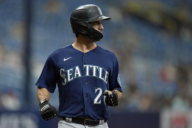 Seattle Mariners' Adam Frazier scores on an RBI triple by Eugenio Suarez off Tampa Bay Rays pitcher Jeffrey Springs during the first inning of a baseball game Thursday, April 28, 2022, in St. Petersburg, Fla. (AP Photo/Chris O'Meara)