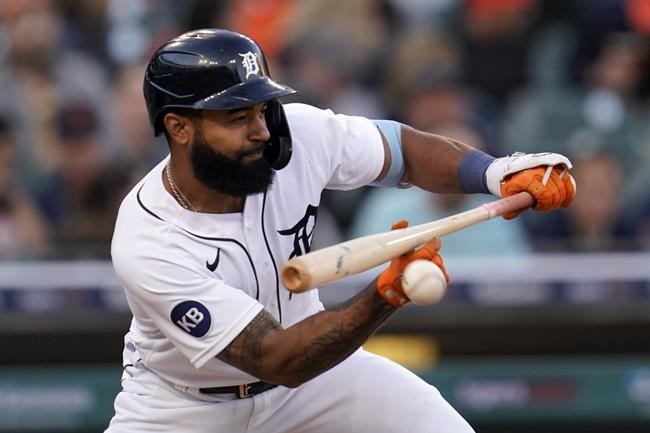 Detroit Tigers' Derek Hill hits a sacrifice bunt against the Oakland Athletics in the third inning of a baseball game in Detroit, Monday, May 9, 2022. (AP Photo/Paul Sancya)