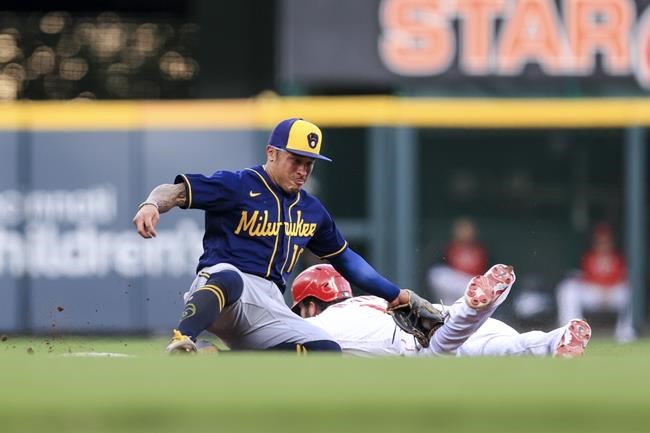 Milwaukee Brewers' Kolten Wong, left, tags out Cincinnati Reds' Tyler Naquin as he attempts to steal second base during the fourth inning of a baseball game in Cincinnati, Monday, May 9, 2022. (AP Photo/Aaron Doster)