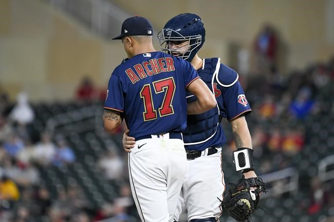 Minnesota Twins catcher Gary Sanchez, right, talks with pitcher Chris Archer after Archer walked Houston Astros' Kyle Tucker and loaded the basses during the third inning of a baseball game, Wednesday, May 11, 2022, in Minneapolis. (AP Photo/Craig Lassig)