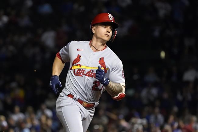 FILE - St. Louis Cardinals' Tyler O'Neill rounds the bases after hitting a three-run home run off Chicago Cubs starting pitcher Zach Davies during the second inning of a baseball game on Sept. 24, 2021, in Chicago. The two-time Gold Glove-winning outfielder went to a salary arbitration hearing with the Cardinals on Friday, May 6, 2022, asking a three-man panel to award him $4.15 million rather than the team's $3.4 million offer. (AP Photo/Charles Rex Arbogast, File)