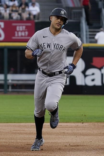 New York Yankees' Giancarlo Stanton run s the bases after hitting a two-run home run during the first inning of the team's baseball game against the Chicago White Sox in Chicago, Friday, May 13, 2022. (AP Photo/Nam Y. Huh)