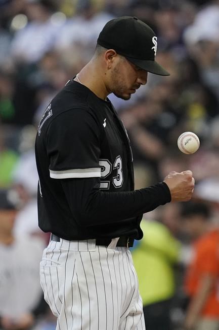 Chicago White Sox starting pitcher Vince Velasquez tosses the ball during the first inning of the team's baseball game against the New York Yankees in Chicago, Friday, May 13, 2022. (AP Photo/Nam Y. Huh)