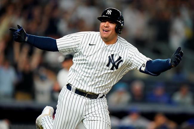 NEW YORK (AP) — As his line drive landed safely in left field, Jose Trevino tossed his bat aside and broke into a big smile on the way to first base.