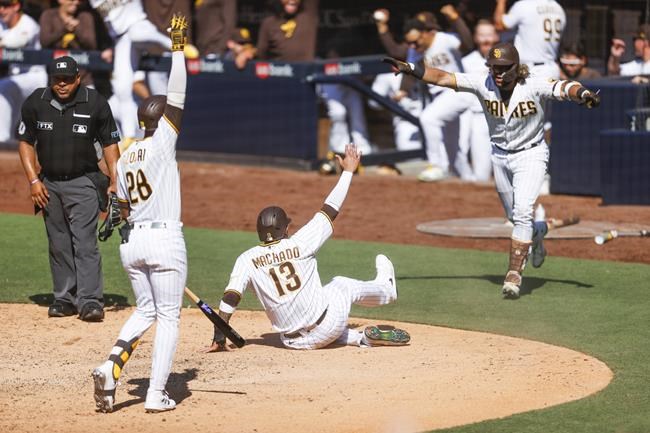 The Padres won the first game 2-1 when automatic runner Manny Machado hustled home in the 10th inning on a two-out wild pitch and a throwing error by catcher Elias Díaz.