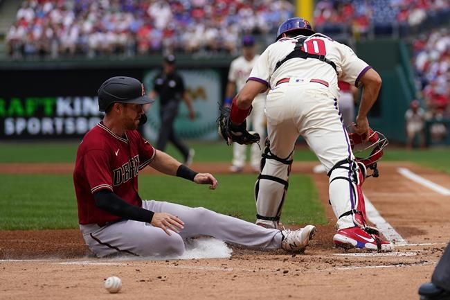Two batters later, catcher J.T. Realmuto dropped a throw from pitcher Ranger Suarez (4-4) on a forceout attempt at home. Realmuto had a chance to turn a 1-2-3, inning-ending double play, but Arizona instead scored two runs and added another on Daulton Varsho’s RBI groundout. Realmuto had three hits.