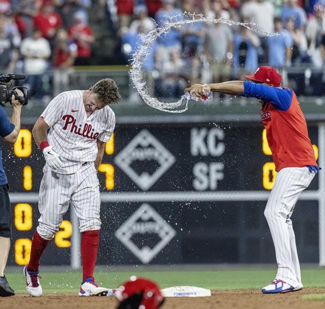 PHILADELPHIA (AP) — Matt Vierling had a two-out, green light to steal and slid head-first so ferociously into second base that his helmet about tumbled into the outfield. That set the moment for Rhys Hoskins, who through 571 career games and 2,065 at-bats had never won a game for the Phillies on the final swing of the night.