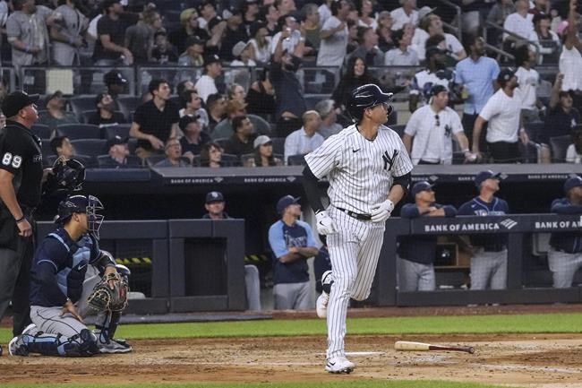They set a record for most consecutive wins in the new Yankee Stadium, stretching their streak to 13 with a 4-3 victory over the Tampa Bay Rays on Wednesday night. Aaron Judge hit his major league-leading 25th home run and No. 9 batter Kyle Higashioka followed an intentional walk with a three-run drive that built a four-run lead.