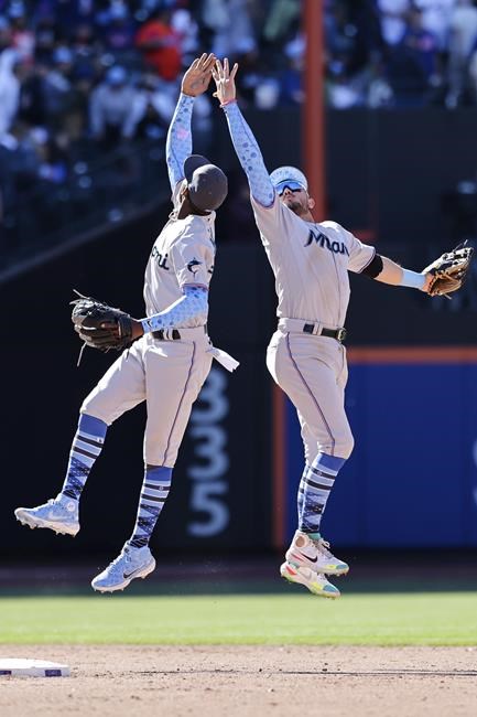 Miami Marlins second baseman Jazz Chisholm Jr. and shortstop Miguel Rojas (11) celebrate a win over the New York Mets, Sunday, June 19, 2022, in New York. (AP Photo/Jessie Alcheh)