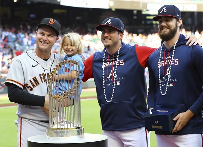 Pederson wore his signature pearls for the first time this season as he received his 2021 World Series ring before the game. He was one of four outfielders the Braves acquired last year after Acuña went down with a season-ending knee injury and quickly became a fan favorite with key hits and the pearls he started wearing in September.