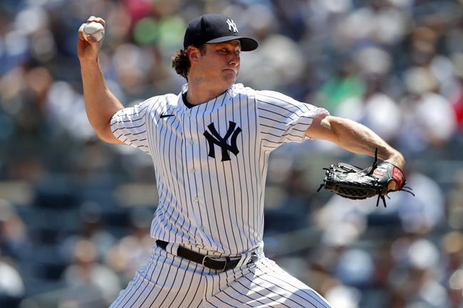 New York Yankees starting pitcher Gerrit Cole (45) throws against the Houston Astros during the first inning of a baseball game Saturday, June 25, 2022, in New York. (AP Photo/Noah K. Murray)