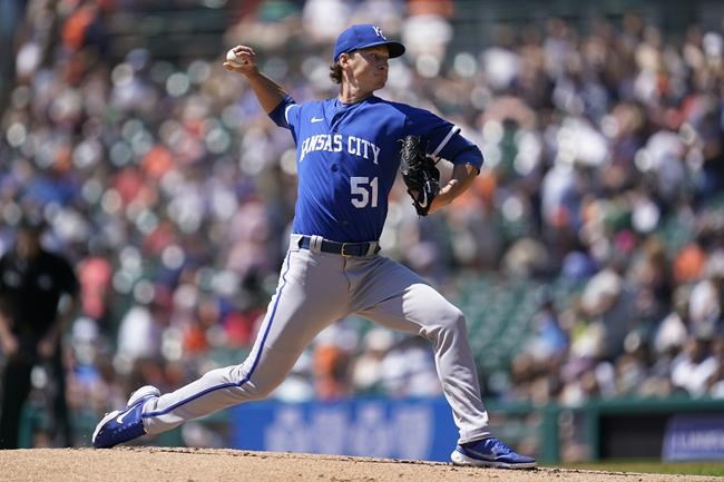 Kansas City Royals pitcher Brady Singer throws against the Detroit Tigers in the first inning of a baseball game in Detroit, Sunday, July 3, 2022. (AP Photo/Paul Sancya)