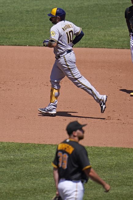Omar Narváez gave the Brewers their two runs by driving a cutter from Pirates starter Zach Thompson (3-6) 427 feet in the fifth inning over the Clemente Wall in right field. The longest homer of Narváez’s major league career nearly bounced into the Allegheny River, was his third of the season and ended a 25-game drought.