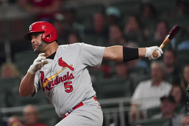 St. Louis Cardinals pinch hitter Albert Pujols drives in a run with a sacrifice fly in the seventh inning of a baseball game against the Atlanta Braves, Thursday, July 7, 2022, in Atlanta. (AP Photo/John Bazemore)
