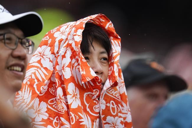 A spectator uses a promotional Hawaiian shirt giveaway to protect against light rain during the sixth inning of a baseball game between the Baltimore Orioles and the Los Angeles Angels, Saturday, July 9, 2022, in Baltimore. The Orioles won 1-0. (AP Photo/Julio Cortez)