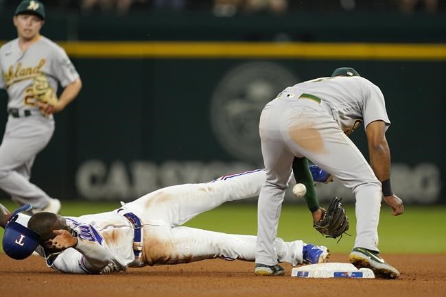 ARLINGTON, Texas (AP) — Chad Pinder hit a grand slam during an eight-run 12th inning and the Oakland Athletics overcame another homer by Corey Seager to beat the Texas Rangers 14-7 Tuesday night.