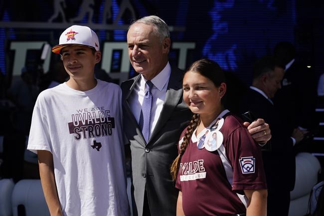 MLB Commissioner Rob Manfred, center, poses for photos with Aidan, left, and Willa Suarez, of Uvalde, Tex., during the 2022 MLB baseball draft, Sunday, July 17, 2022, in Los Angeles. (AP Photo/Jae C. Hong)