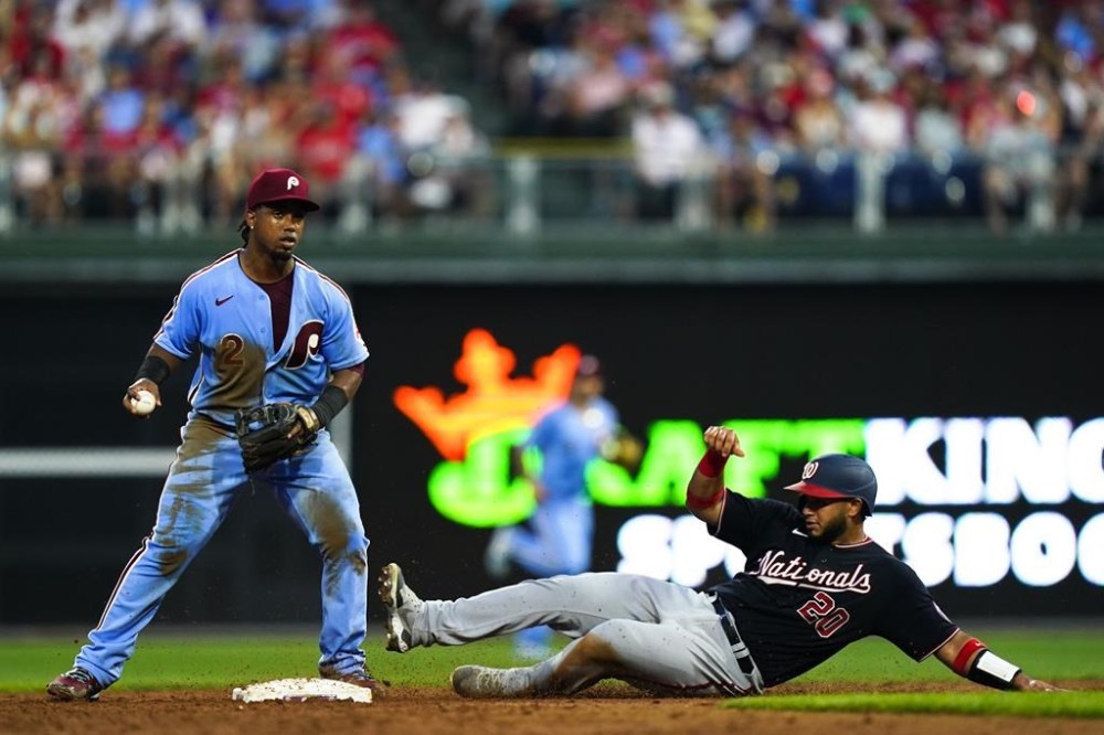 Philadelphia Phillies' Jean Segura forces out Washington Nationals' Keibert Ruiz during the third inning of a baseball game, Thursday, Aug. 4, 2022, in Philadelphia. (AP Photo/Matt Rourke)