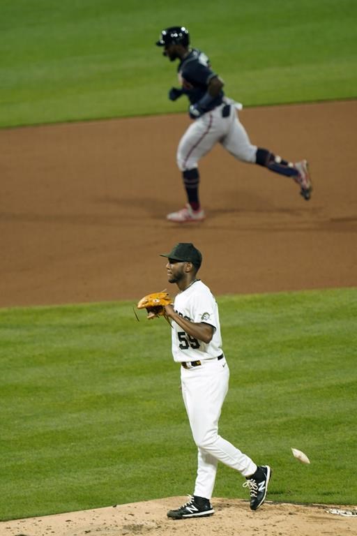 Harris’ home run followed a lead-off single from Vaughn Grissom, Atlanta’s first two hits since Ronald Acuña Jr. exited a 62-minute rain delay with a double to lead off the first.