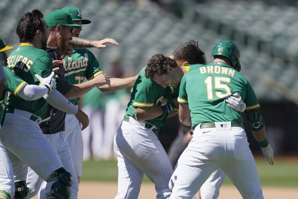 Following Tony Kemp’s sacrifice bunt, Nick Allen singled and Sean Murphy drew a two-out walk that loaded the bases, setting up Chad Pinder’s two-run single.