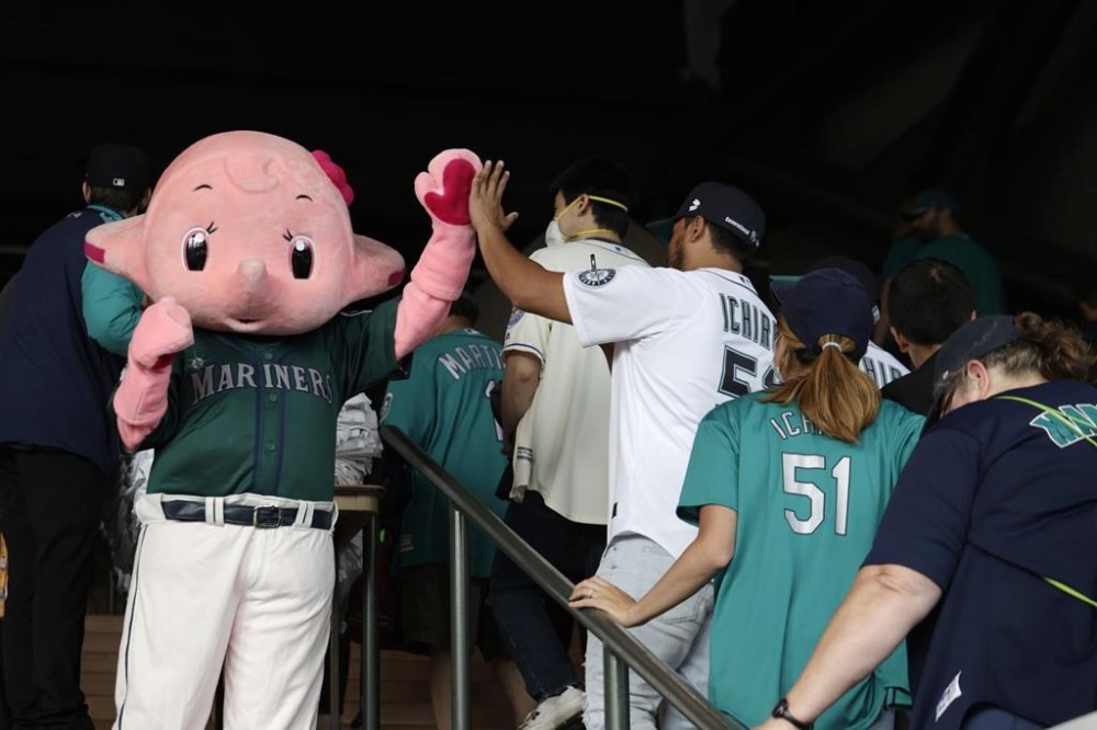 A mascot for Sato Pharmaceutical of Japan greets fans as they arrive on the day former Seattle Mariners player Ichiro Suzuki is inducted into the Mariners Hall of Fame in a pregame ceremony before a baseball game between the Mariners and the Cleveland Guardians, Saturday, Aug. 27, 2022, in Seattle. Ichiro, who prefers to use only his first name, joins nine other Mariners already in the Mariners HOF. Ichiro is a 10-time All-Star and American League Rookie of the Year in 2001. (AP Photo/John Froschauer)