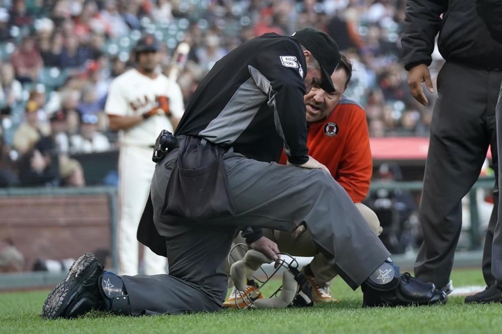 Umpire: Hudson exited in the bottom of the first with right knee discomfort after slipping and landing awkwardly with his right knee bent above his left leg. Hudson was tracking the ball on Tommy La Stella’s foul popup when he fell. Giants athletic trainer Dave Groeschner checked on Hudson and walked him out a nearby tunnel by the visitors’ dugout. It delayed the game approximately 10 minutes. Second base umpire John Tumpane moved behind the plate to replace Hudson.