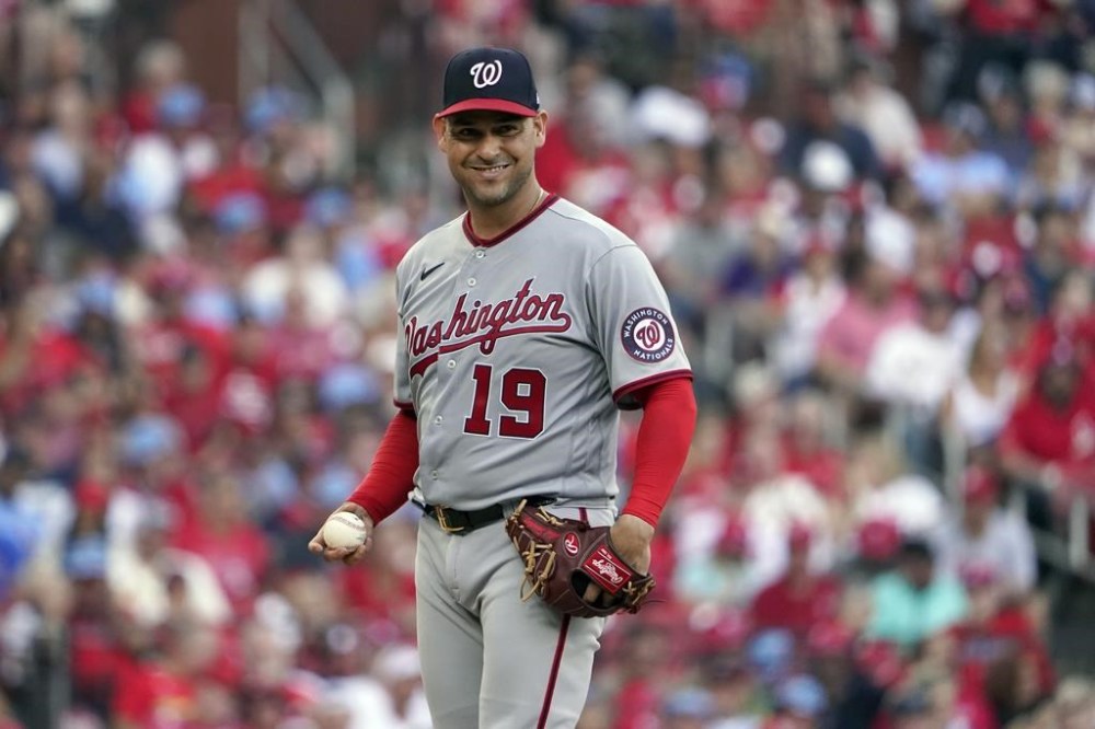 Washington Nationals starting pitcher Anibal Sanchez looks over at first base after giving up a single to St. Louis Cardinals' Yadier Molina during the fifth inning of a baseball game Monday, Sept. 5, 2022, in St. Louis. (AP Photo/Jeff Roberson)