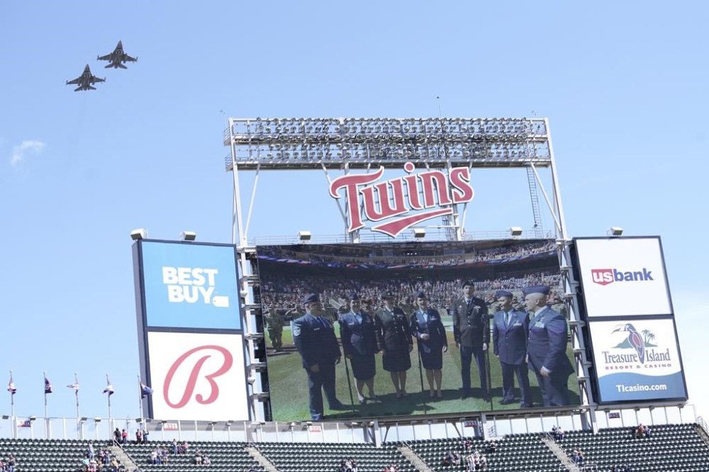 Two F16 fighter planes fly over Target field at the end of the national anthem as the Minnesota Twins marked Armed Forces Appreciation Day and remembrance of 9/11 prior to a baseball game against the Cleveland Guardians, Sunday, Sept 11, 2022, in Minneapolis. (AP Photo/Jim Mone)