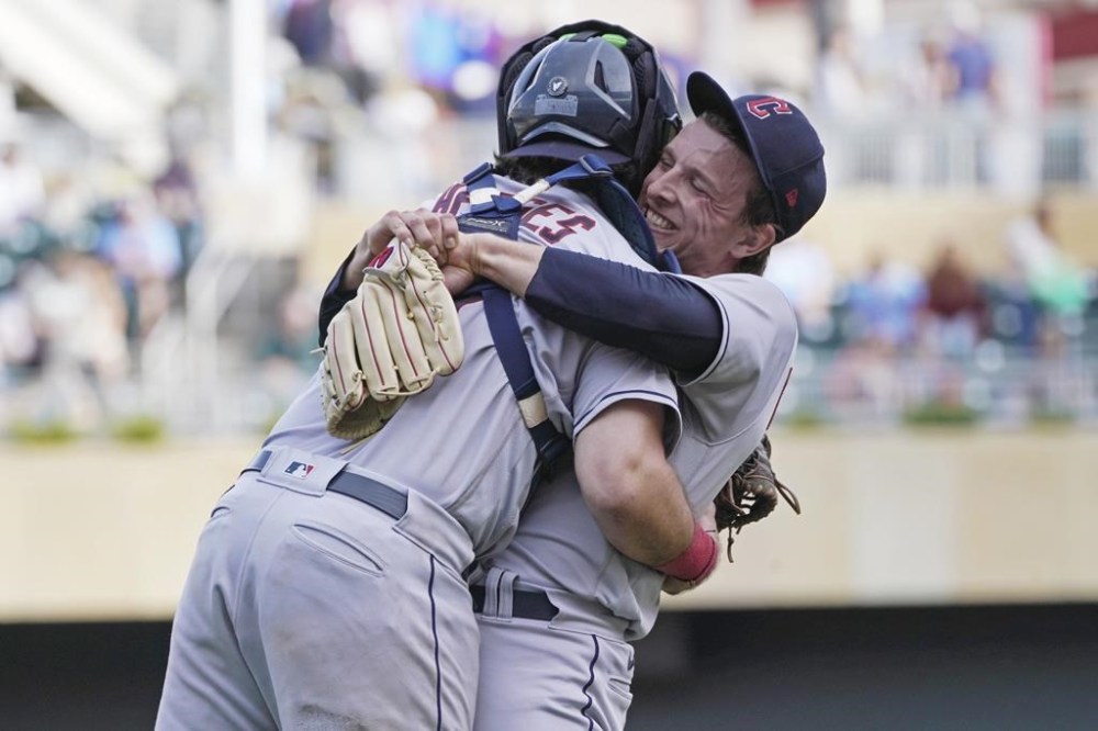Cleveland Guardians pitcher James Karinchak, right, and catcher Austin Hedges celebrate after they defeated the Minnesota Twins in a baseball game, Sunday, Sept 11, 2022, in Minneapolis. (AP Photo/Jim Mone)