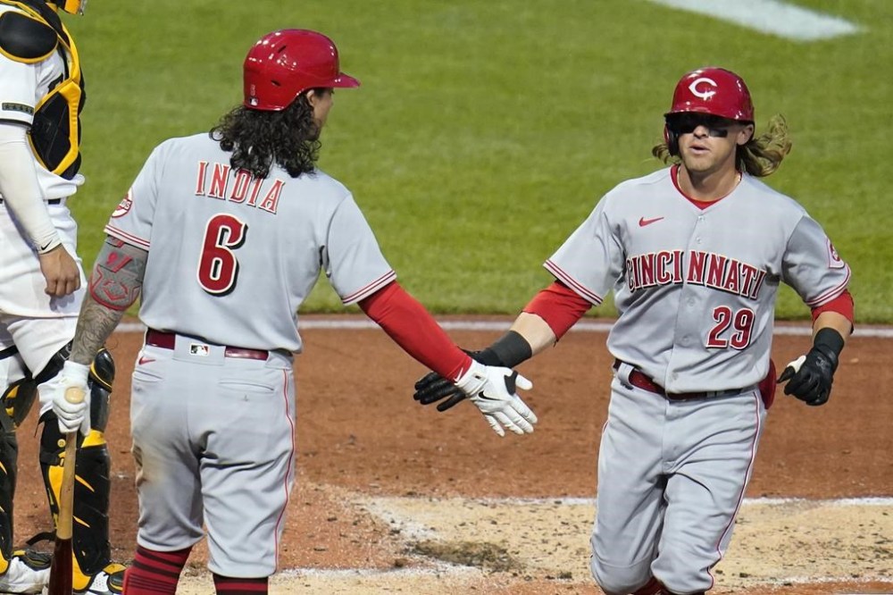 Cincinnati Reds' TJ Friedl (29) is greeted by Jonathan India as he heads to the dugout after hitting a solo home run off Pittsburgh Pirates starting pitcher Roansy Contreras during the third inning of a baseball game in Pittsburgh, Monday, Sept. 26, 2022. (AP Photo/Gene J. Puskar)