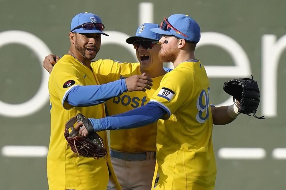 Boston Red Sox players, from left, Tommy Pham, Enrique Hernandez and Alex Verdugo celebrate after beating the Baltimore Orioles 5-3 in a baseball game, Thursday, Sept. 29, 2022, in Boston. (AP Photo/Steven Senne)