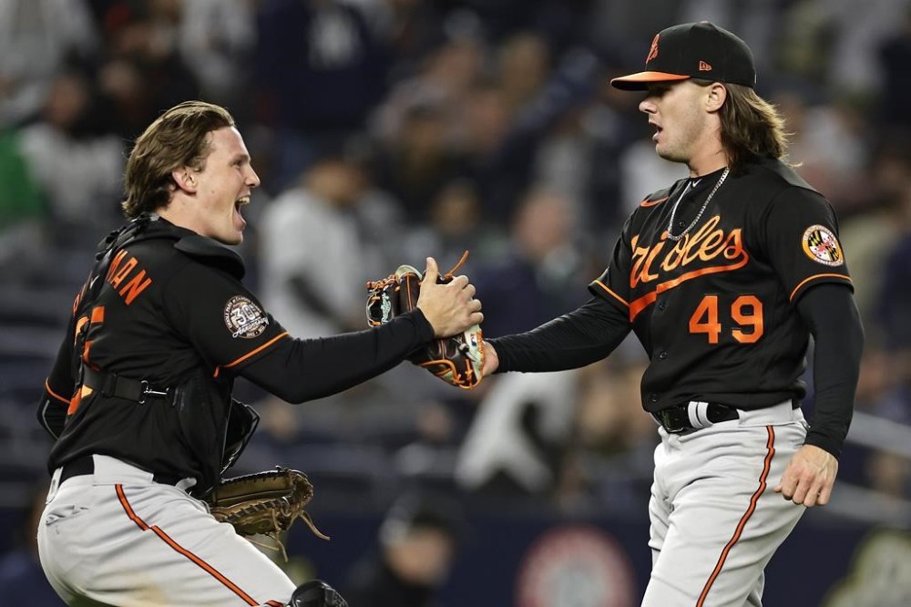 Baltimore Orioles pitcher DL Hall (49) celebrates with Adley Rutschman after the team's 2-1 win in a baseball game against the New York Yankees on Friday, Sept. 30, 2022, in New York. (AP Photo/Adam Hunger)