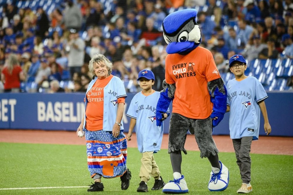 Residential school survivor throws first pitch at Jays game for Orange Shirt Day